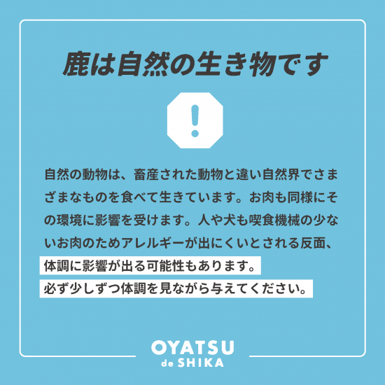 自然の動物は、畜産された動物と違い自然界でさまざまなものを食べて生きています。お肉も同様にその環境に影響を受けます。人や犬も食べ慣れていないお肉のためアレルギーが出にくいとされる反面、体調に影響が出る可能性もあります。