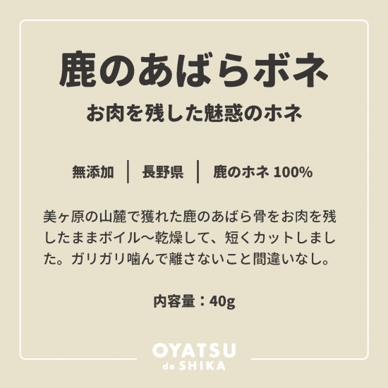 美ヶ原の山麓で獲れた鹿のあばら骨をお肉を残したままボイル〜乾燥して、短くカットしました。ガリガリ噛んで離さないこと間違いなし。