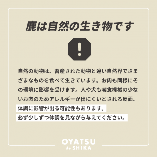 自然の動物は、畜産された動物と違い自然界でさまざまなものを食べて生きています。お肉も同様にその環境に影響を受けます。人や犬も食べ慣れていないお肉のためアレルギーが出にくいとされる反面、体調に影響が出る可能性もあります。